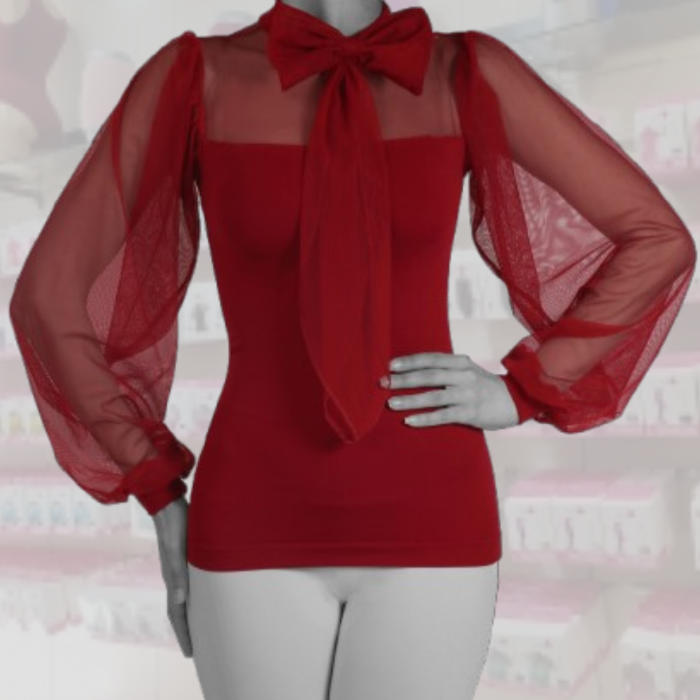 De opvallende strik bij de hals geeft een speelse en chique touch, perfect voor speciale gelegenheden. De transparante, luchtige mouwen met een lichte glans creëren een verfijnde uitstraling en voegen een vleugje glamour toe aan je outfit. De elastische manchetten zorgen ervoor dat de mouwen perfect blijven zitten en dragen bij aan het draagcomfort.