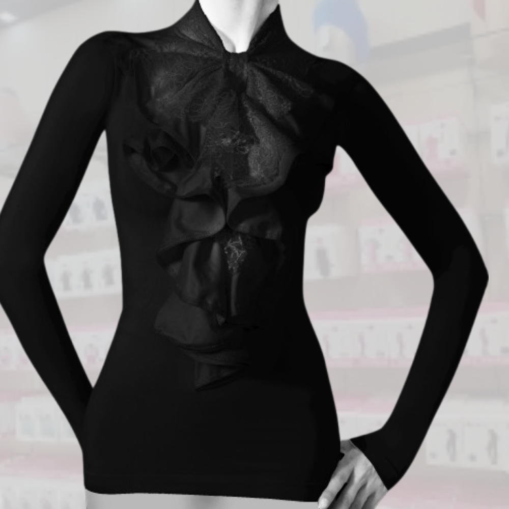 Stijlvolle zwarte blouse met lange mouwen, ontworpen met een verfijnde ruches-afwerking aan de voorkant die elegantie toevoegt aan elke outfit. Het zachte, hoogwaardige materiaal biedt comfort en een perfecte pasvorm, ideaal voor zowel formele als casual gelegenheden. De delicate details op de kraag en het unieke ontwerp maken dit kledingstuk een stijlvolle keuze voor modebewuste vrouwen.